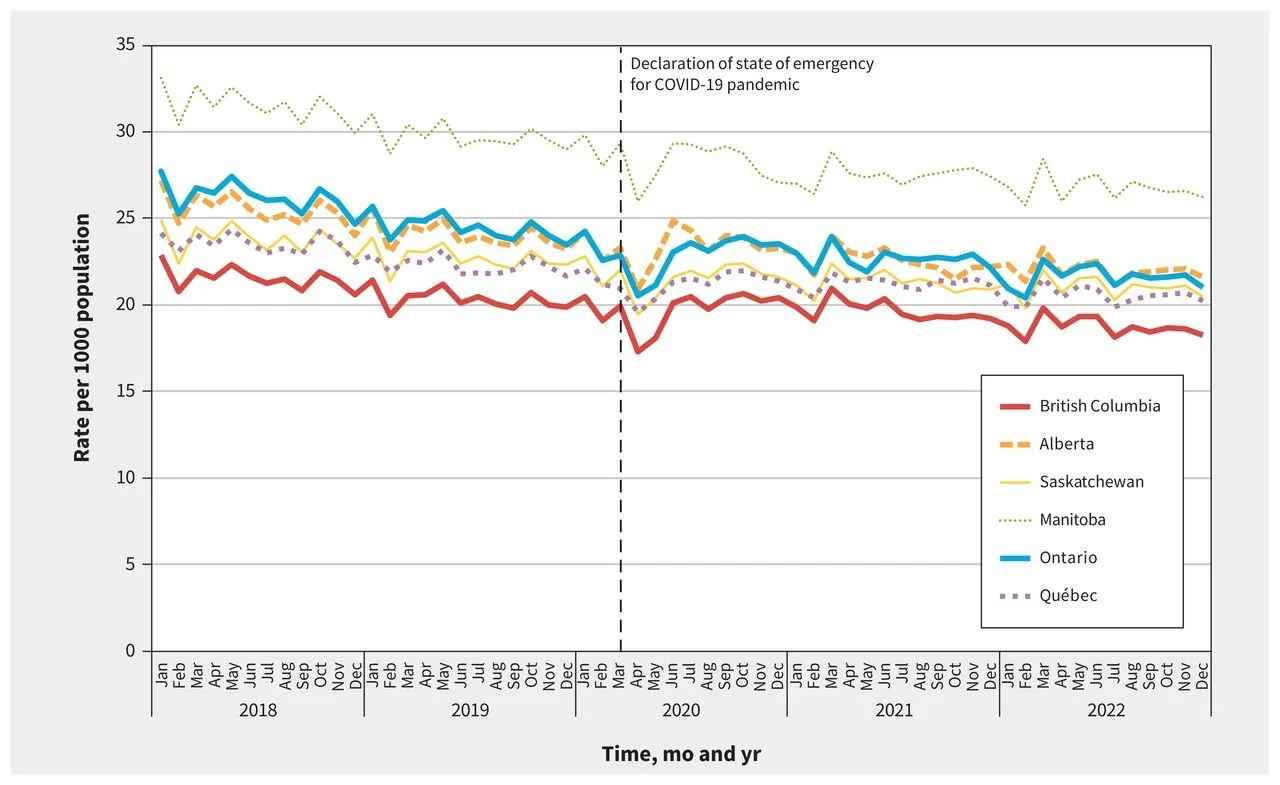 Monthly Rate of Opioid Prescribing in 6 Canadian Provinces