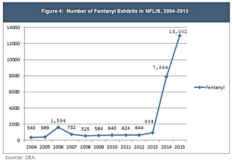 The report highlighted the fact that U.S. forensic laboratories tested over 13,000 seized drugs containing fentanyl in 2015, up sharply from less than a thousand cases two years earlier.