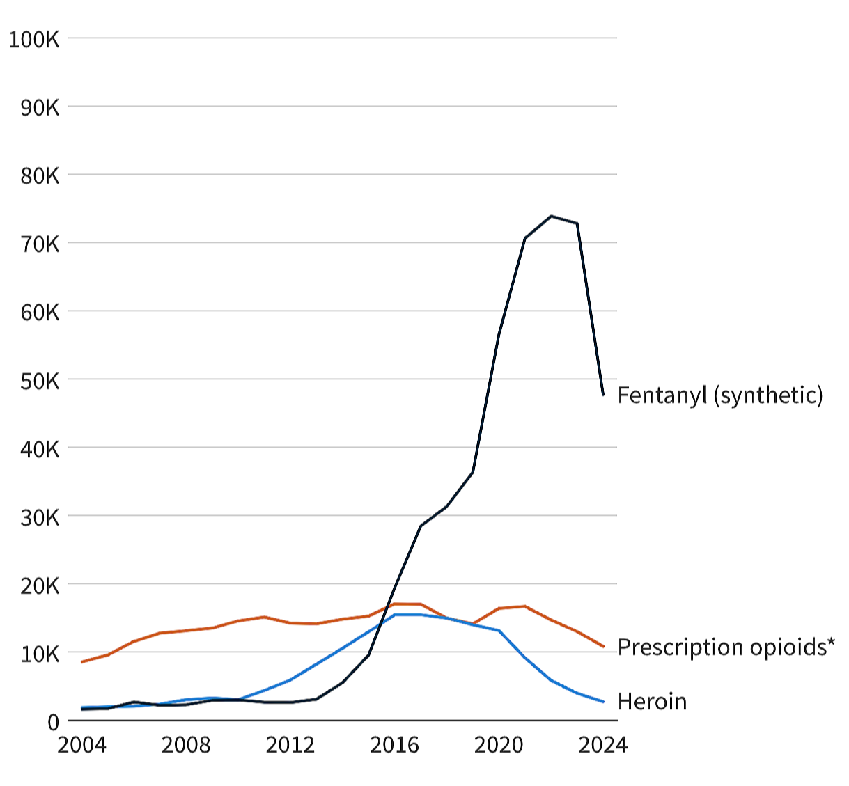 In 2024, 10,851 Americans died from an overdose involving a natural or semi-synthethic prescription opioid, compared to 47,735 deaths involving synthetic opioids, mostly illicit fentanyl.