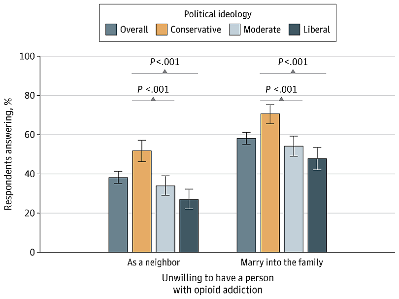 "It remains striking that nearly one-half of self-described liberals indicated unwillingness to have a person with opioid addiction marry into their family," wrote Harold Pollack, PhD, a Professor of Public Health at the University of Chicago, in a commentary also published in JAMA. "The stigma of current opioid addiction crosses political lines."